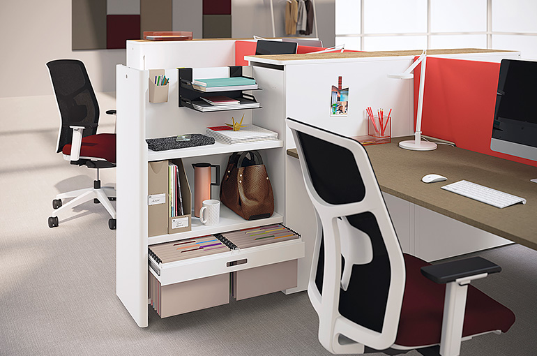 Sur les postes partagés ou en duo, le caisson mobile partagé reste imbattable : accès immédiat, rangement verrouillable, design épuré.